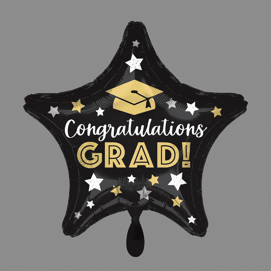Die Botschaft „Congratulations Grad!“ steht für Anerkennung, Stolz und Vorfreude auf die Zukunft. Der Stern als Symbol ergänzt diese Bedeutung perfekt und verleiht der Feier zusätzlichen Glanz. Mit diesem Ballon wird die positive Stimmung sichtbar gemacht und den Gästen wie dem Absolventen gleichermaßen vermittelt.