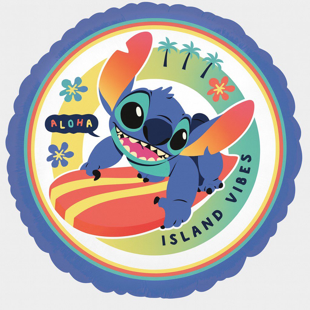 Der runde Ballon zeigt Stitch in einer fröhlichen Surferpose auf einem rot-gelb gestreiften Surfbrett. Im Hintergrund finden sich bunte Blumen, Palmen und sanfte Pastellfarben, die an hawaiianische Sonnenuntergänge erinnern. Ein Sprechblasen-Detail mit dem Wort „Aloha“ und der Schriftzug „Island Vibes“ runden das Design ab und versprühen echtes Urlaubsfeeling.