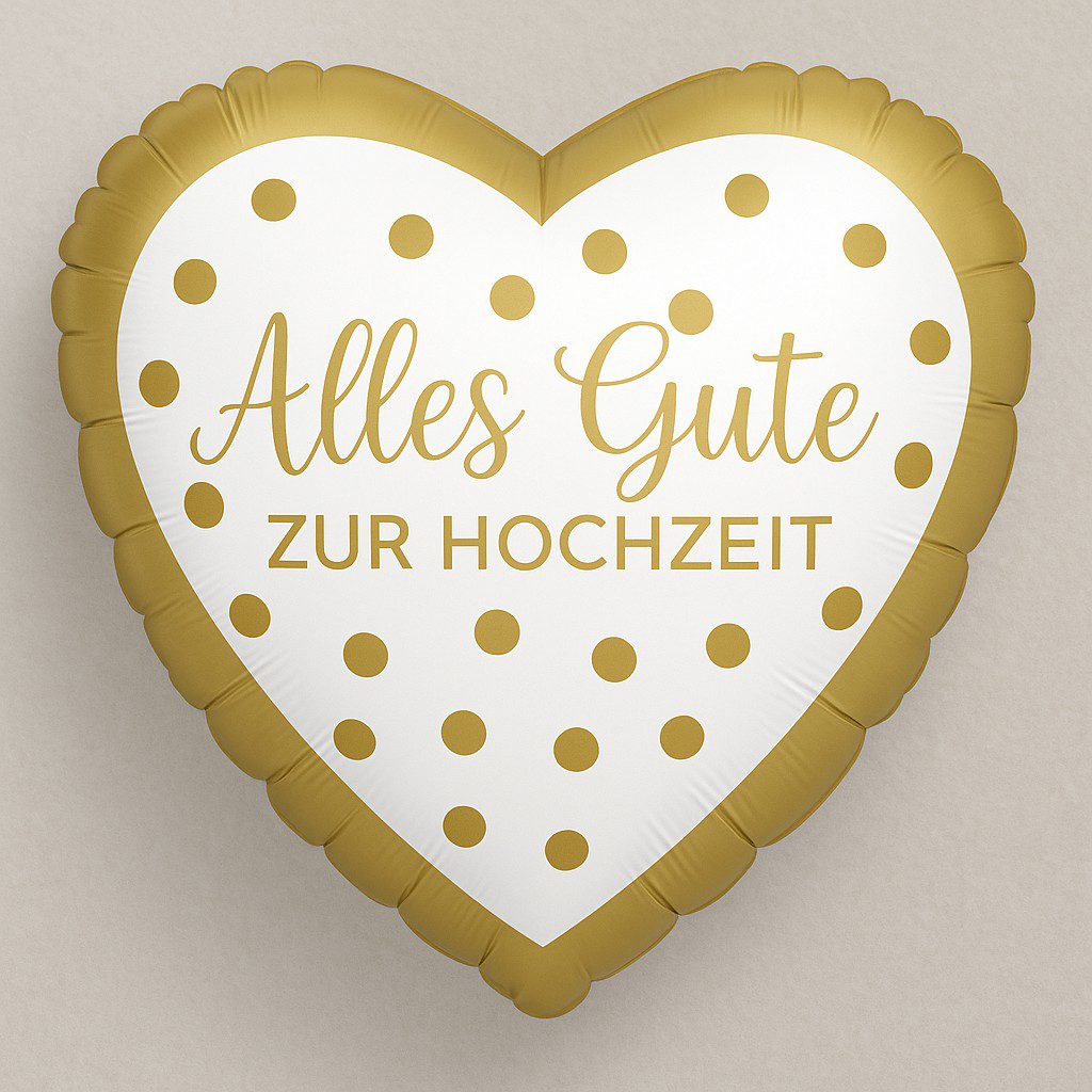 Das Herz ist in einem strahlenden Weiß gehalten und mit glänzenden, goldenen Punkten verziert. Die Aufschrift „Alles Gute zur Hochzeit“ ist in einer geschwungenen, romantischen Schrift gestaltet, wobei ein dezenter Ehering als grafisches Detail das „o“ im Wort „Gute“ schmückt. Dieses Design wirkt modern, elegant und festlich zugleich – ideal für den Hochzeitstag.