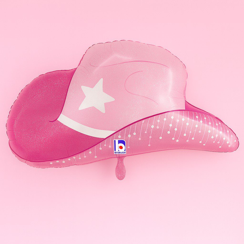 Der Ballon präsentiert sich in leuchtendem Pink, verziert mit funkelnden Akzenten und einem auffälligen weißen Stern auf der Vorderseite. Diese liebevollen Details verleihen ihm eine verspielte, aber dennoch stilvolle Ausstrahlung. Die geschwungene Form erinnert an echte Cowboy- und Cowgirlhüte, was ihn perfekt für Western-, Country- oder Ranch-Mottopartys macht.