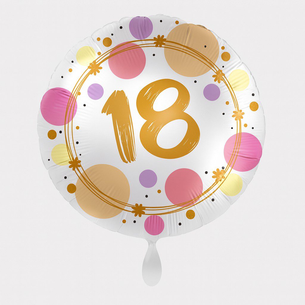 Der Ballon 18 mit Punkten und Blumen 43cm überzeugt durch sein harmonisches Design. Die Zahl „18“ hebt den Anlass direkt hervor und macht sofort deutlich, dass es sich um einen ganz besonderen Geburtstag handelt. Umgeben von verspielten Punkten und floralen Mustern wirkt der Ballon festlich und stilvoll zugleich.