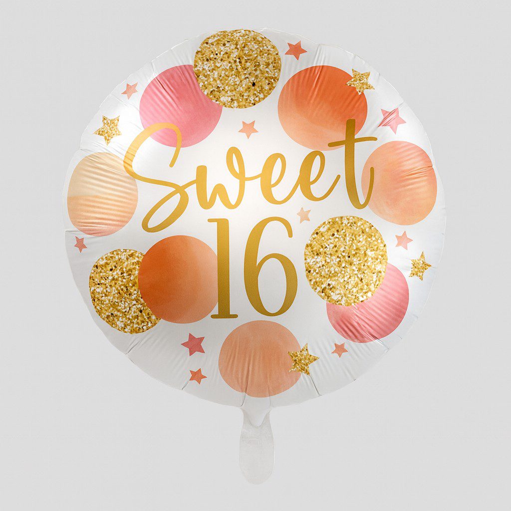Die Aufschrift „Sweet 16“ und das fröhliche Design unterstreichen die emotionale Bedeutung dieses Geburtstages und machen den Ballon zu einem Symbol der Freude und des Neubeginns.